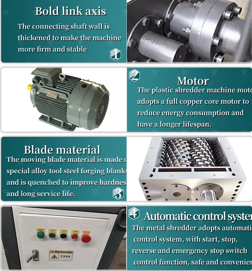 Multi-functional waste shredder is widely used in industrial scrap metal recycling, plastic recycling, tire recycling, electronics manufacturing, pallet manufacturing, wood processing, paper industry, domestic waste recycling and other fields. It is suitable for crushing solid materials; For example electronic waste, metal, wood, plastic, waste tires, chemical drums, pallets and so on.