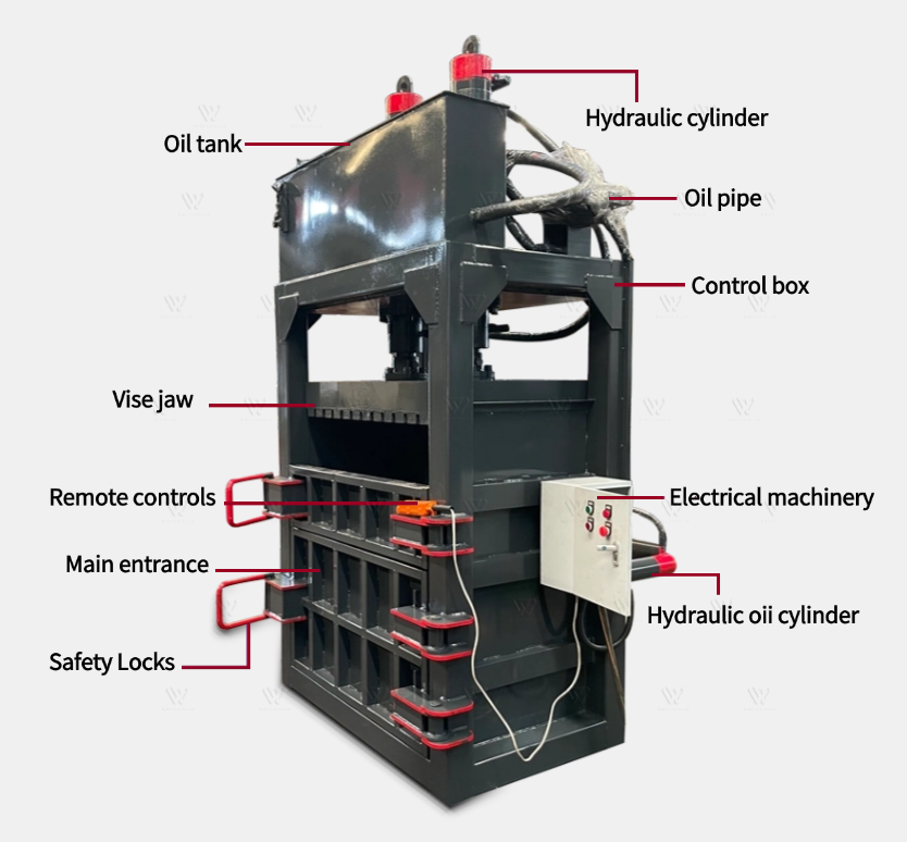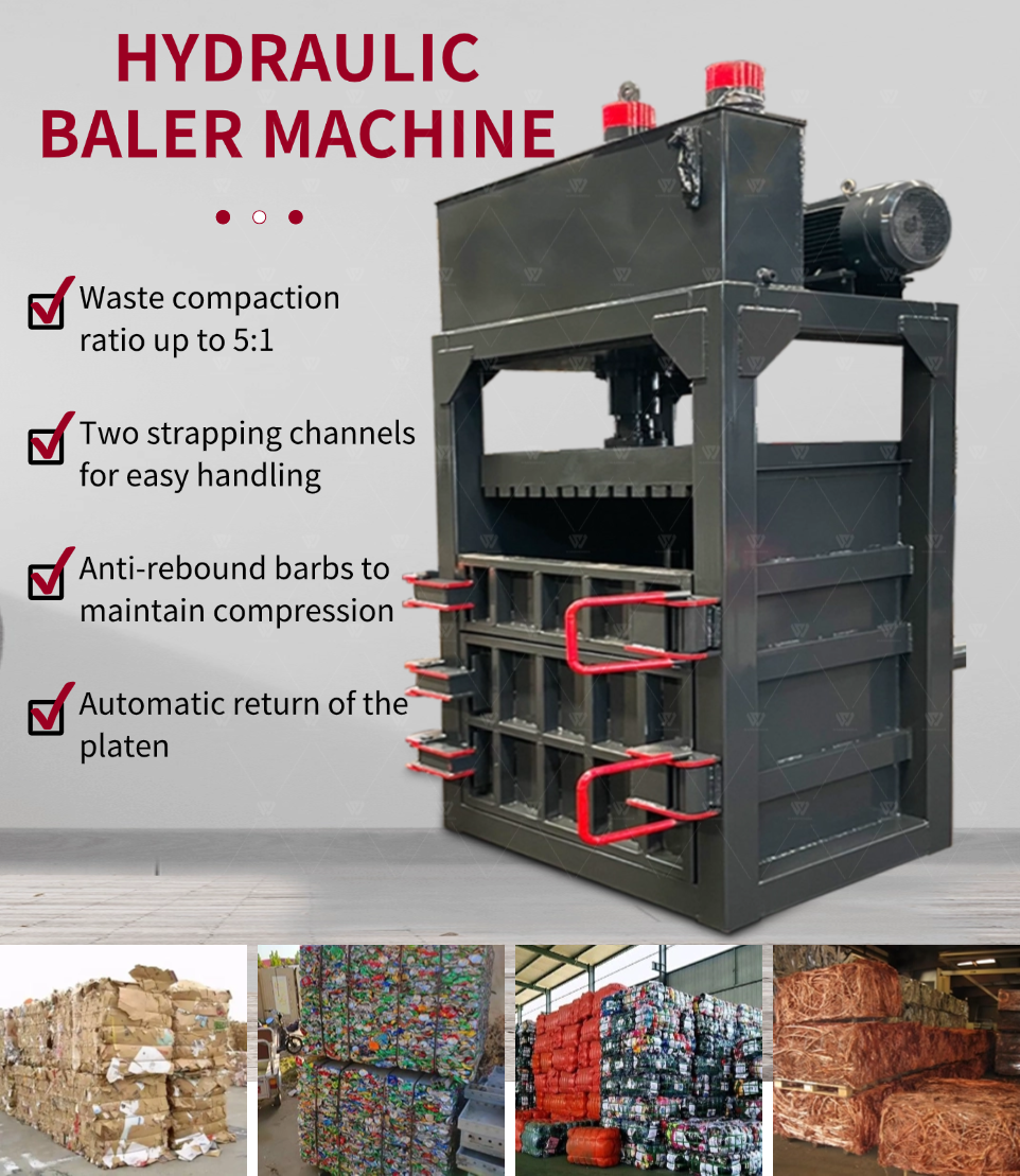 Vertical hydraulic baler is used for compressing and baling loose materials. It uses hydraulic drive to compress compressible resources to reduce the volume and form a whole. The bale has high density and uniform size. It is packaged with wire or strapping tape.