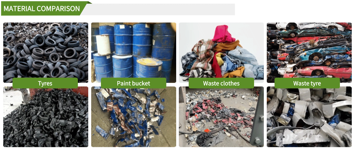 The materials that can be crushed by the metal shredder include: scrap metal, cans and bottles, scrap iron briquettes, scrap steel, scrap aluminum, scrap car shells, scrap building steel bars, scrap steel plates and other scrap metal materials.