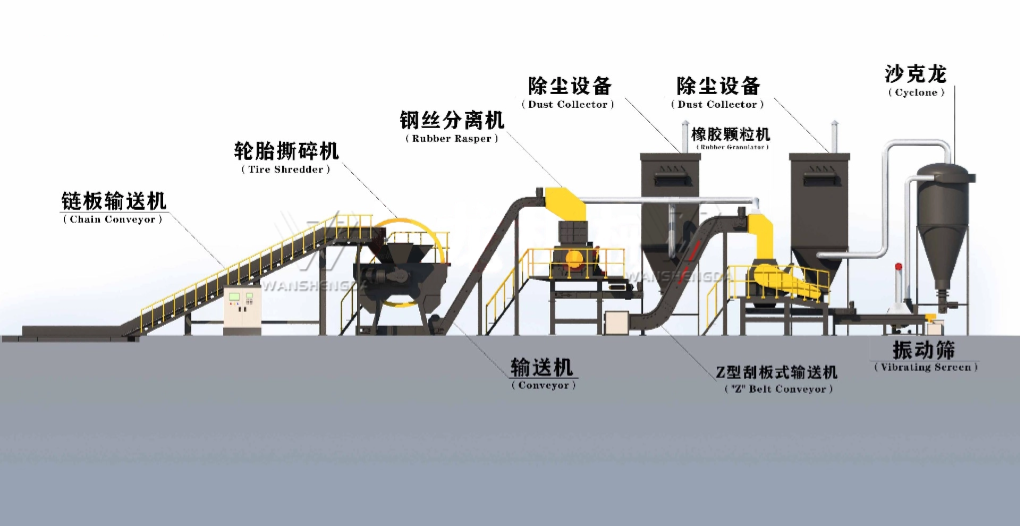 High rate. The waste tire processing production line can recycle tires with diameters ranging from 400 to 3000mm according to customer requirements. It has strong applicability, and the output size can be controlled within the range of 5 to 100mm, with high output